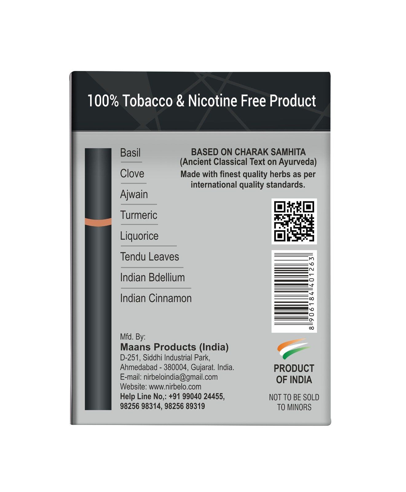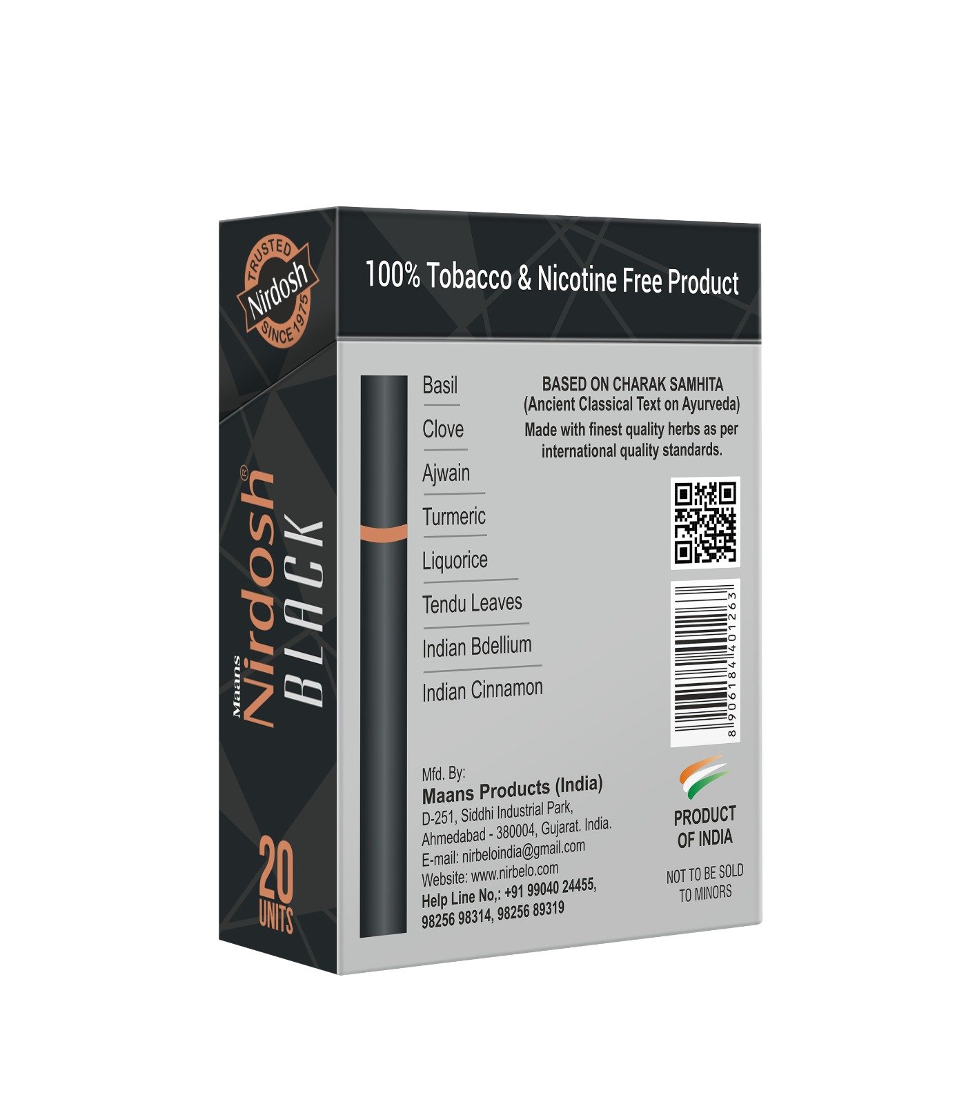 • Made with 100% natural Ayurvedic herbs, the Nirdosh Black Herbal Cigarette supports a mindful lifestyle. Whether you’re trying to quit smoking or simply enjoy herbal smoking for its therapeutic benefits, this herbal smoke Black variant offers the perfect balance of flavour, relaxation, and wellness.